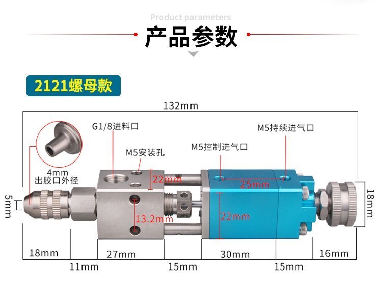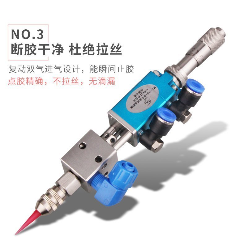 氣動:點膠閥由氣缸、閥體和料缸三部分上下連接而成,氣缸和閥體用先進密封材料隔開,避免膠水侵入氣缸。料缸和氣缸連接在點膠閥閥主體上,與氣缸保證同心度。用電磁閥氣動氣缸運動,從而驅(qū)動中心桿上下運動,利用中心桿的上下運動達到對膠水的開啟和關(guān)斷作用。根據(jù)開啟和關(guān)斷的方式不同,從而分為:柱塞式點膠閥、頂針式點膠閥、提升式點膠閥、噴霧點膠閥、噴射點膠閥;開關(guān)方式不同,適用的流體也就不同,回吸式點膠閥采用向上運動關(guān)膠結(jié)構(gòu),使停膠同時瞬間回吸斷膠,減少余留針頭上的殘膠,使點膠不產(chǎn)生漏滴、拉絲等現(xiàn)象。膠閥本體經(jīng)鋁合金陽極氧化處理,密封材料采用最新四氟材料,接觸膠體部分均為耐腐蝕材料。