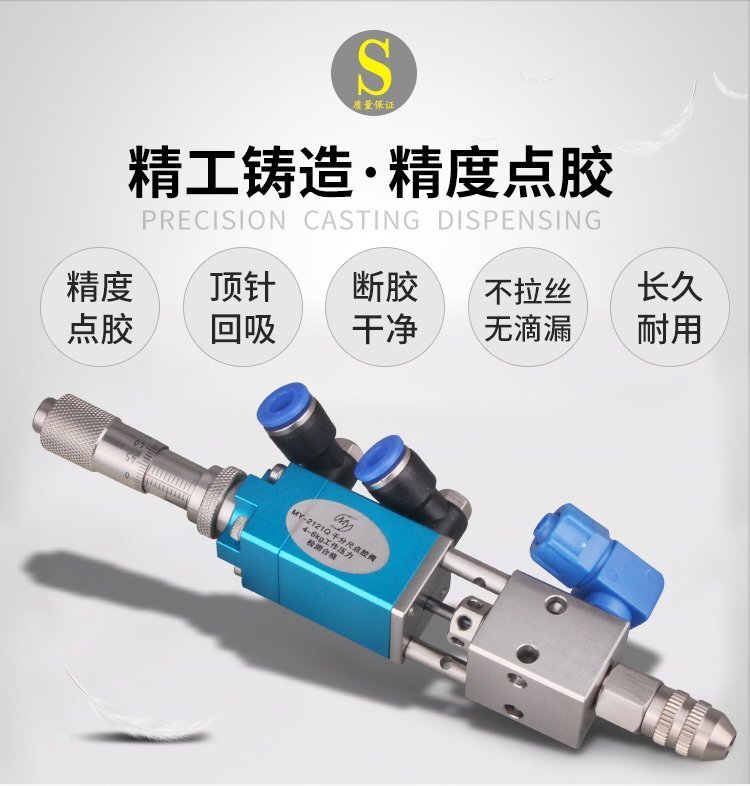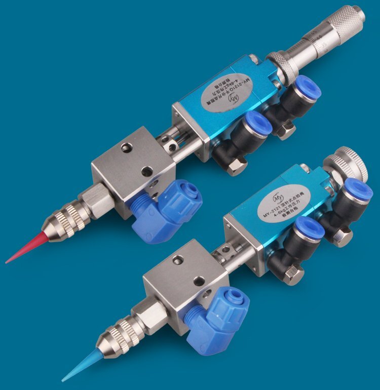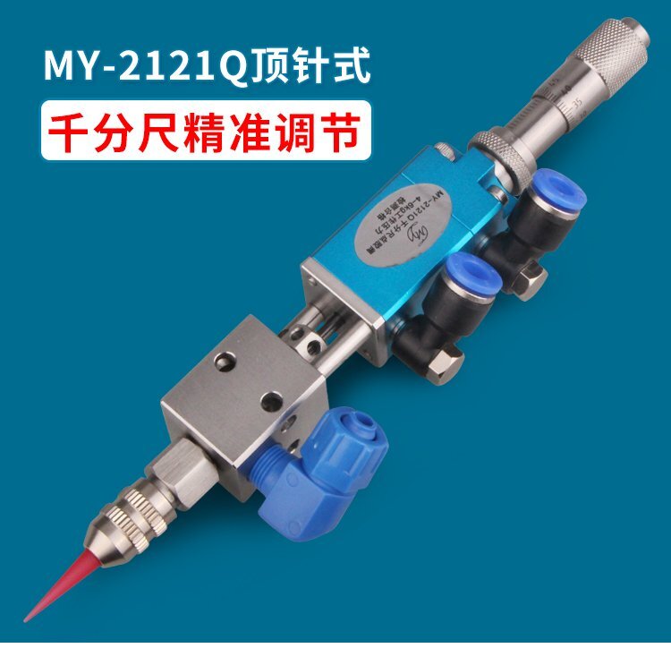 MY-2121Q精密頂針式單液閥,雙向驅(qū)動,千分尺微調(diào),出咀針頭可用針頭帽固定或直 接旋取;適用流動性好,低粘度性水狀流體,如UV膠、墨水、酒精等;可與各種供料泵或儲料壓力桶使用,可接各式點膠針頭,可與全自動點膠機裝配數(shù)個點膠閥同時點膠作業(yè);采用鋁合金陽極化+不銹鋼優(yōu)質(zhì)材料制造,不生銹防腐蝕,適合工程/工廠長期生產(chǎn)使用;有大量現(xiàn)貨供應,歡迎咨詢采購!