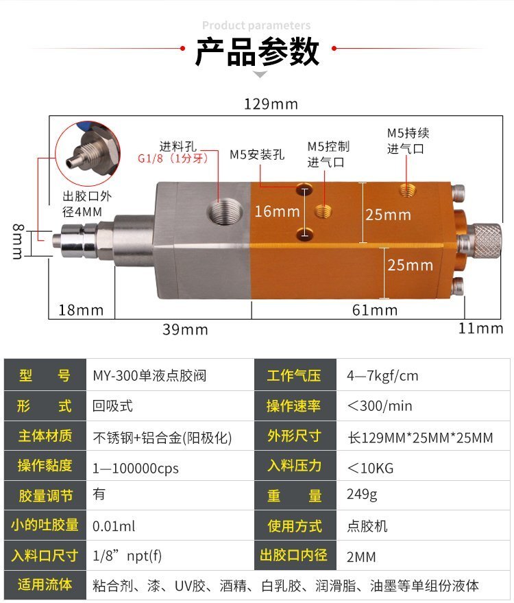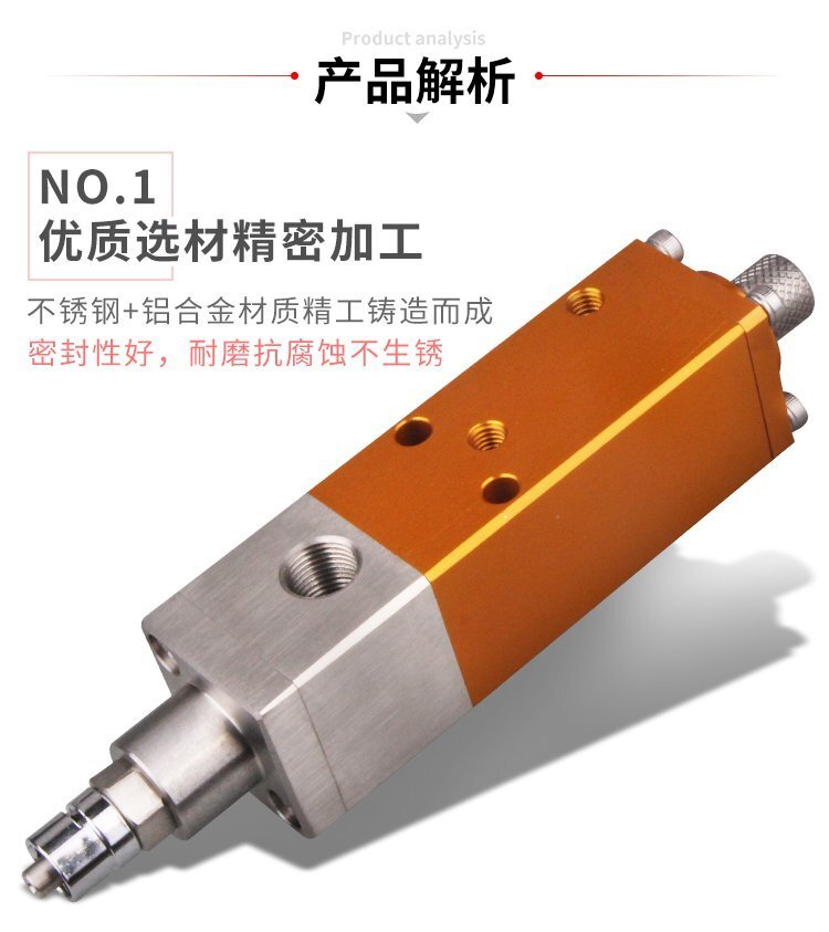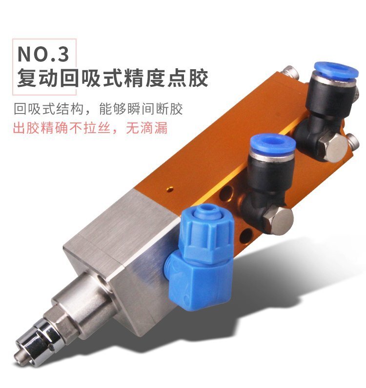 MY-300精密回吸式單液點膠閥,帶回吸功能,點膠精確、出膠順暢、不拉絲、不滴 漏;可與各種供料泵或儲料壓力桶使用,可接各式點膠針頭,可與全自動點膠機裝配數(shù)個點膠閥同時點膠作業(yè);采用鋁合金陽極化+不銹鋼優(yōu)質(zhì)材料制造,不生銹防腐蝕,適合工程/工廠長期生產(chǎn)使用;有大量現(xiàn)貨供應(yīng),歡迎咨詢采購!