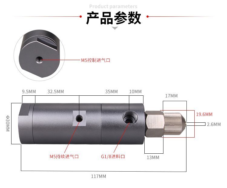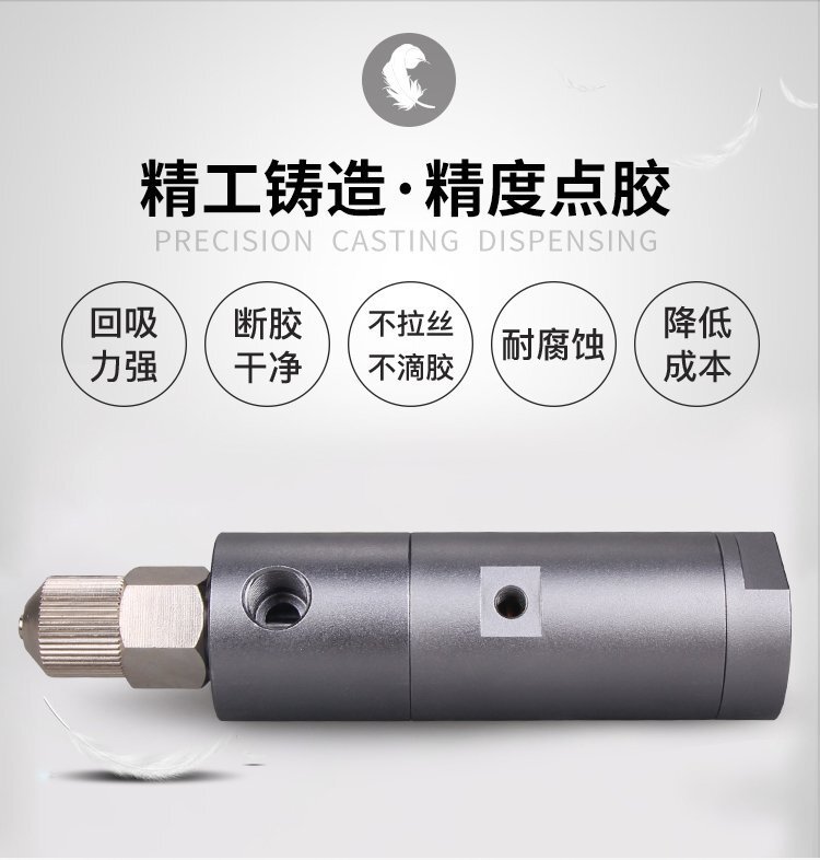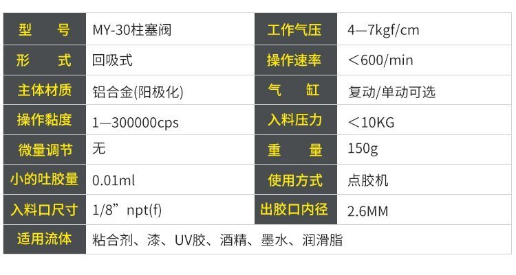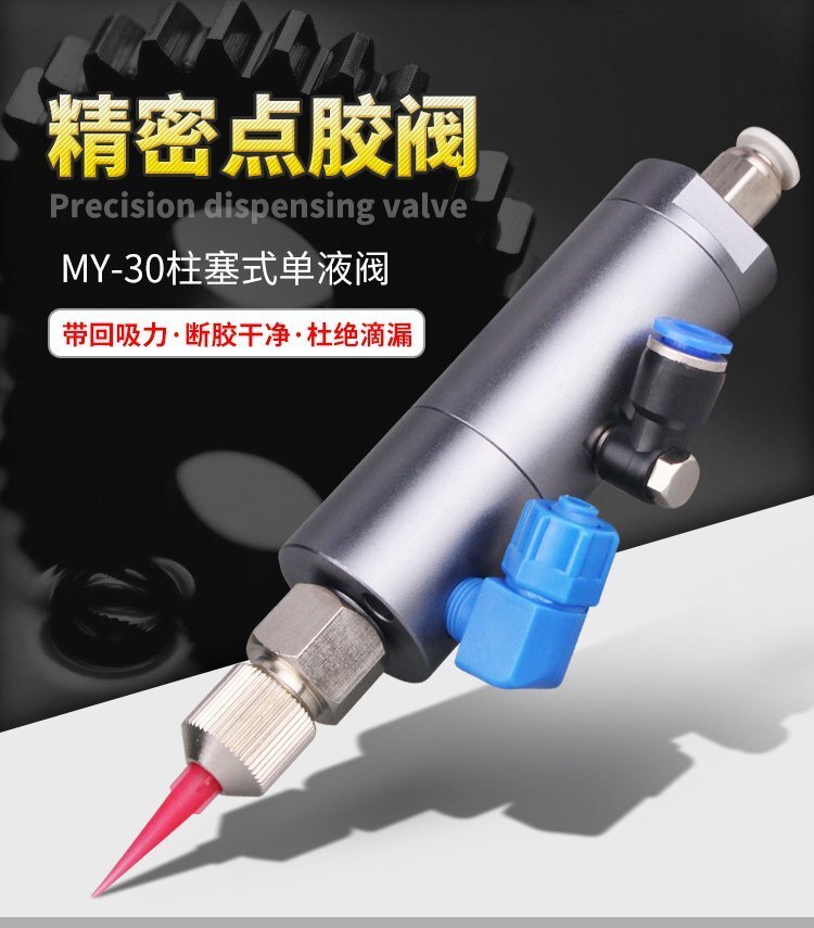 MY-30柱塞式單液點膠閥,帶回吸功能,點膠精確、出膠順暢、不拉絲、不滴漏; 可與各種供料泵或儲料壓力桶使用,可接各式點膠針頭,可與全自動點膠機(jī)裝配數(shù)個點膠閥同時點膠作業(yè);采用鋁合金陽極化+不銹鋼優(yōu)質(zhì)材料制造,不生銹防腐蝕,適合工程/工廠長期生產(chǎn)使用;有大量現(xiàn)貨供應(yīng),歡迎咨詢采購!
