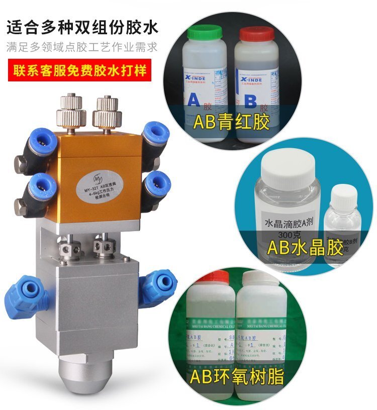 MY-32T復(fù)動(dòng)隔離回吸式AB雙液閥,采用多重密封技術(shù),專(zhuān)門(mén)為雙組份膠水混合而 設(shè)計(jì),適合各種雙組份膠水,如:青紅膠、環(huán)氧樹(shù)脂膠、硅膠等雙組份膠水;通過(guò)微調(diào)螺母調(diào)節(jié)膠量大小,具有回吸力強(qiáng)、出膠順暢、不拉絲、不滴漏、耐腐蝕等特點(diǎn);采用鋁合金陽(yáng)極化+不銹鋼優(yōu)質(zhì)材料制造,不生銹防腐蝕,適合工程/工廠(chǎng)長(zhǎng)期生產(chǎn)使用;有大量現(xiàn)貨供應(yīng),歡迎咨詢(xún)采購(gòu)!