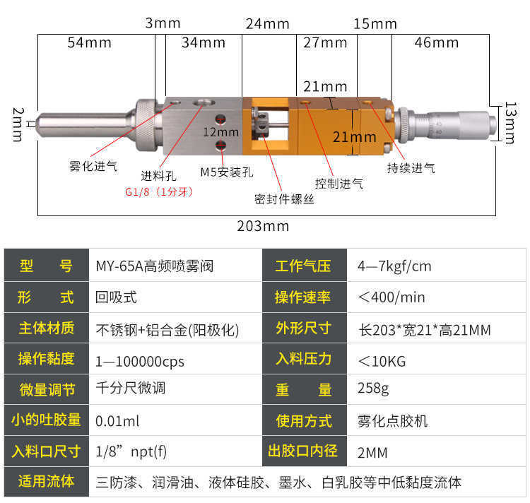 MMY-65A高頻噴霧閥,適用于三防漆等中,低粘度流體噴涂(5mm-50mm)5000cps 以下粘度適用;可精密微量調(diào)節(jié)液體大小,可調(diào)霧化口霧化距離,實現(xiàn)調(diào)節(jié)霧化顆粒大小,噴頭灑落面積等;霧化壓力短暫保持,確保噴嘴清理,防止堵塞,保證流體的均勻霧化;采用鋁合金陽極化+不銹鋼優(yōu)質(zhì)材料制造,不生銹防腐蝕,適合工程/工廠長期生產(chǎn)使用;有大量現(xiàn)貨供應,歡迎咨詢采購!