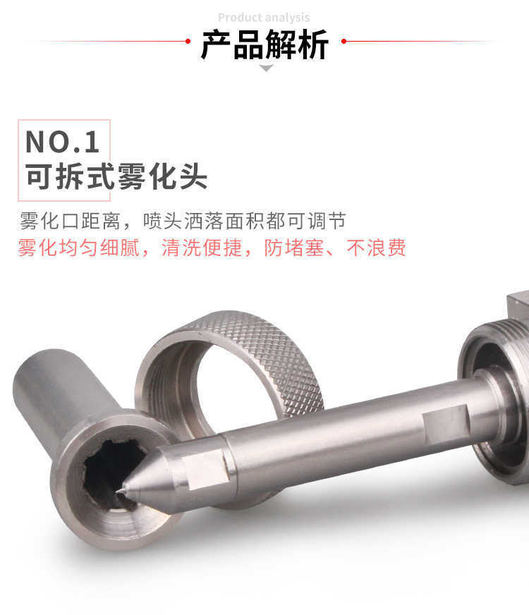 1、可精密微量調(diào)節(jié)液體大小,可調(diào)霧化口霧化距離,實現(xiàn)調(diào)節(jié)霧化顆粒大小,噴頭灑落面積等;
