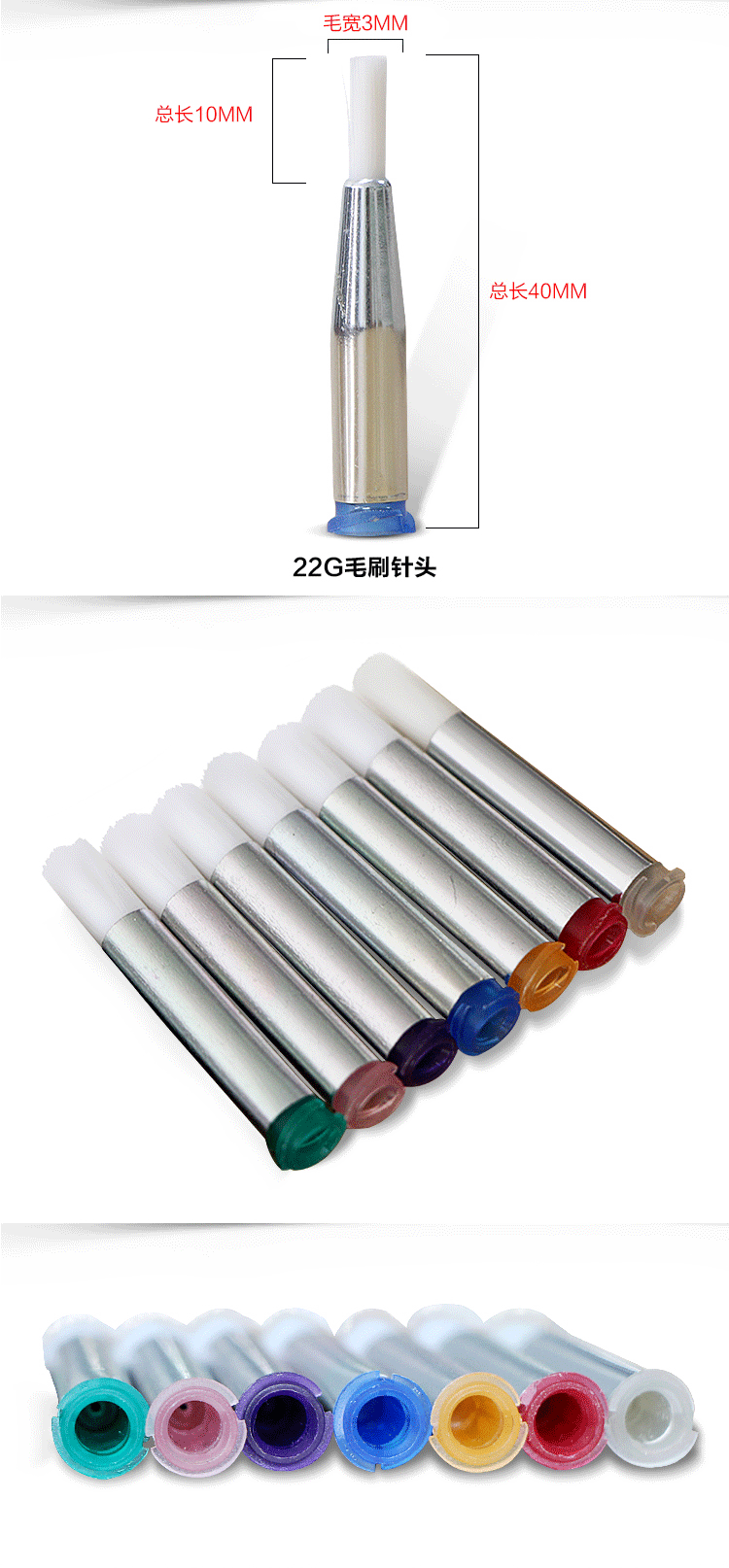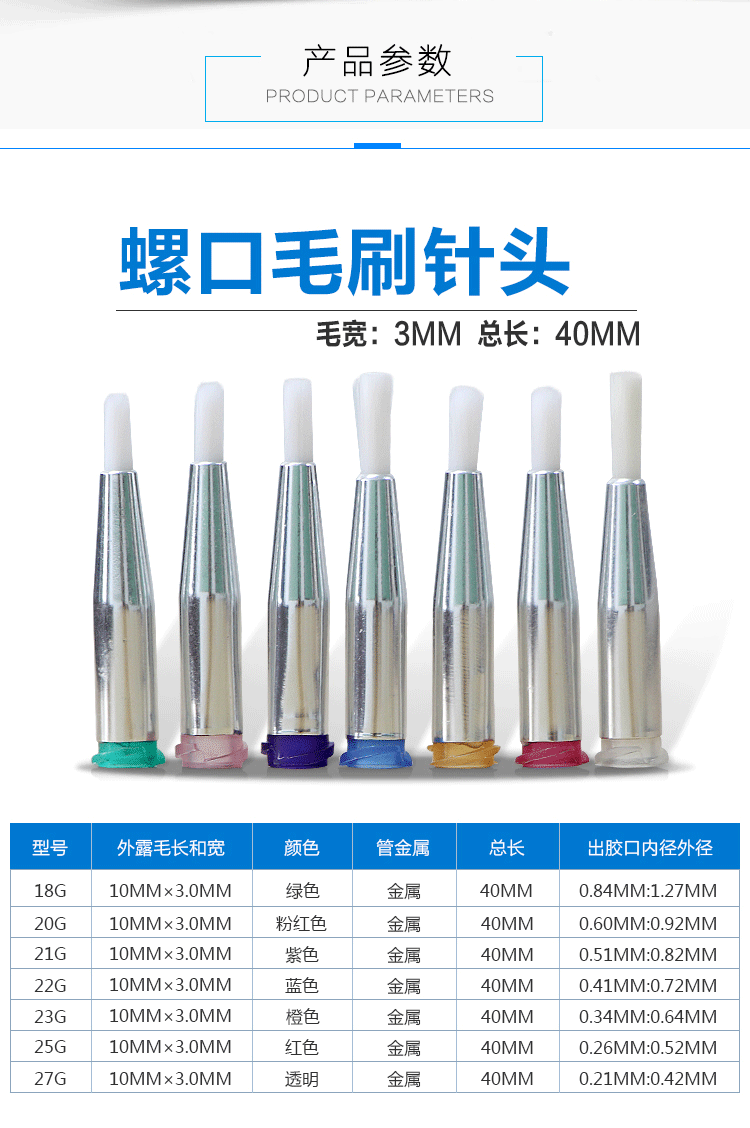 毛刷針頭主要針對不同面積涂膠的產(chǎn)品工藝,具有涂膠均勻、不堆膠、不斷膠,適合大面積表面刷圖膠液;毛刷為尼龍材質(zhì),韌性佳,不斷毛,不 掉毛,軟毛接觸產(chǎn)品,安全可靠,極大的提高生產(chǎn)效率!