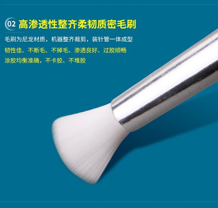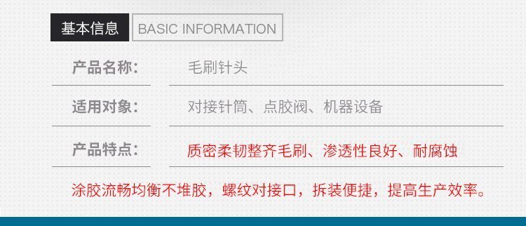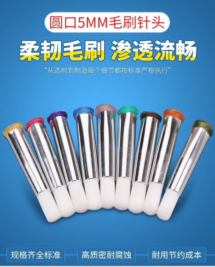 毛刷針頭主要針對不同面積涂膠的產(chǎn)品工藝,具有涂膠均勻、不堆膠、不斷膠,適合大面積表面刷圖膠液;毛刷為尼龍材質(zhì),韌性佳,不斷毛,不 掉毛,軟毛接觸產(chǎn)品,安全可靠,極大的提高生產(chǎn)效率!