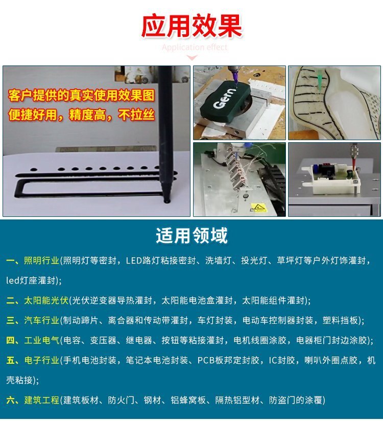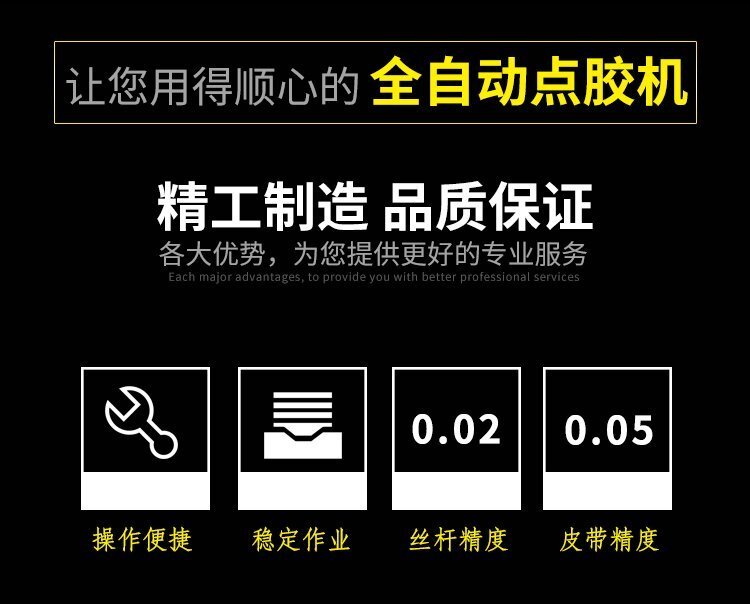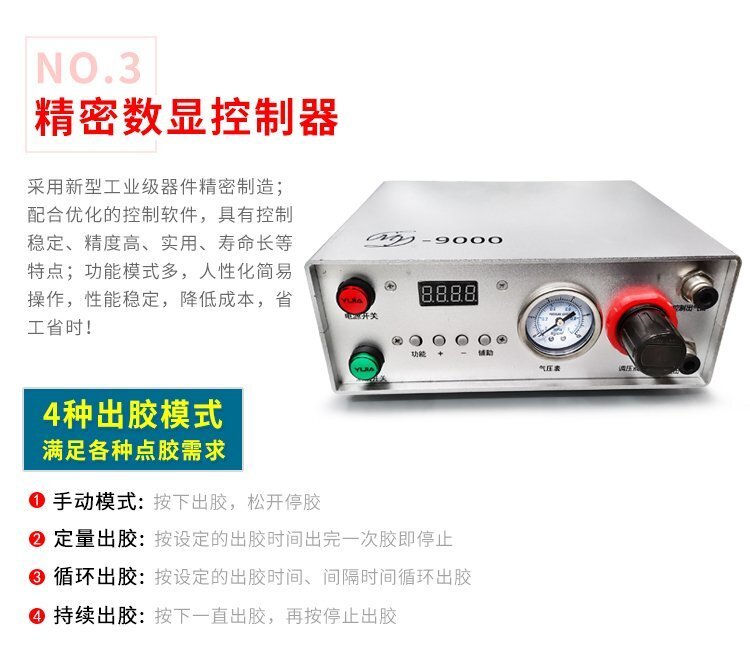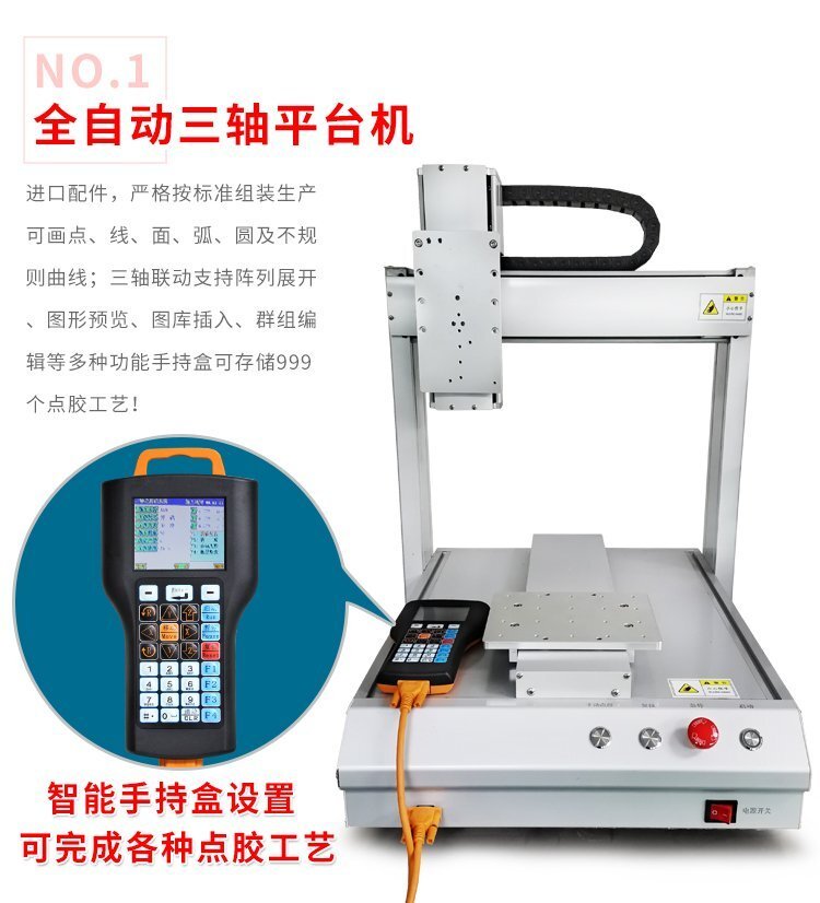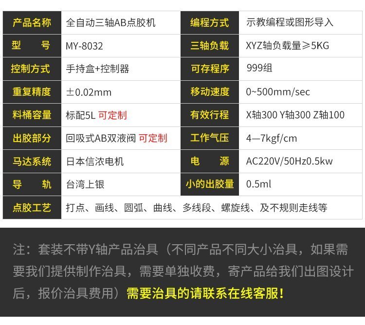 MY-8032T全自動點膠機(jī),三軸機(jī)使用日本信濃電機(jī),意大利意拉泰同步帶,臺灣上銀導(dǎo)軌等強(qiáng)勁組件;支持示教編程或圖形導(dǎo)入,程序記錄數(shù)量多達(dá)999組;適合多種AB雙組份膠水,如:AB硅膠、封灌黑膠、環(huán)氧樹脂、AB水晶膠、AB青紅膠等工業(yè)膠水;配合高精密點膠雙液閥,膠水比例可調(diào)1:1至3:1,出膠穩(wěn)定,斷膠干凈,不拉絲,不滴漏;有大量現(xiàn)貨供應(yīng),歡迎咨詢采購!