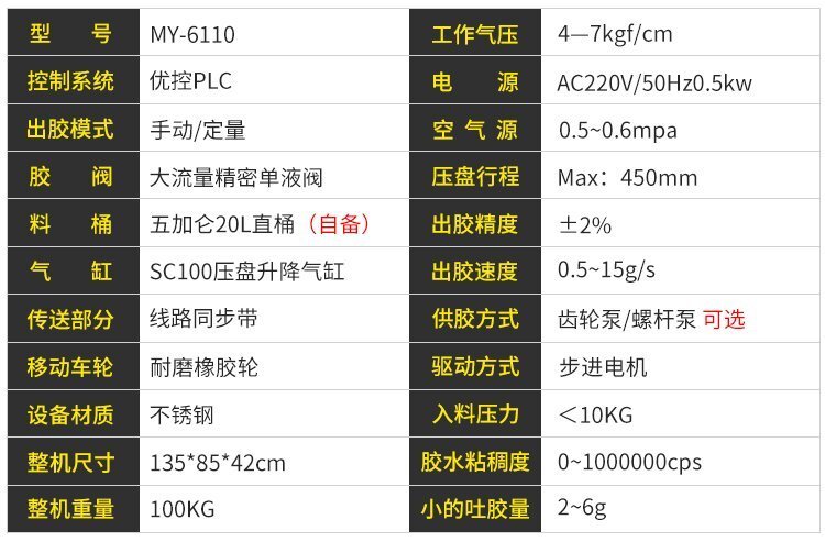 MY-6110高粘度壓盤點膠機,是由本公司自主研發(fā)設(shè)計,精密加工制造的一款高粘度硅膠壓盤泵單液點膠機,采用步進(jìn)機驅(qū)動,齒輪泵/螺桿泵送料,使膠水能夠連續(xù)穩(wěn)定輸出,精度高;主要用在電子行業(yè)、LED行業(yè)、工藝品行業(yè)等廣泛應(yīng)用;具有高壓強出膠,升降大氣缸,出膠快速,持續(xù)穩(wěn)定,高粘度膠水輕松壓出、快速調(diào)試設(shè)置出膠量、精度點膠、定時定 量出膠、智能檢測機器故障報警等功能;適合多種單組份膠水,如:高稠度硅膠、油脂類黏膠、玻璃膠、聚硫膠、潤滑脂、亞克力膠、油漆、固體膠、橡膠、亮漆、瞬間膠等工業(yè)膠水;出膠頭配置精密單液閥