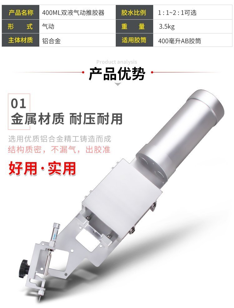 400ml氣動ab雙液推膠器,采用優(yōu)質(zhì)鋁合金材料制造,抗壓耐用,不生銹防腐蝕,配置止漏閥,止膠干凈,不拉絲不滴漏,實現(xiàn)高精度點膠效果,可與各種自動化設(shè)備搭配使用;適合工程/工廠長期生產(chǎn)使用;有大量現(xiàn)貨供應(yīng),歡迎咨詢采購!