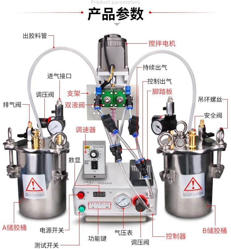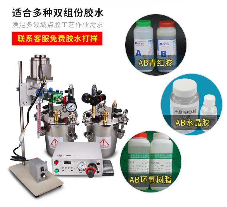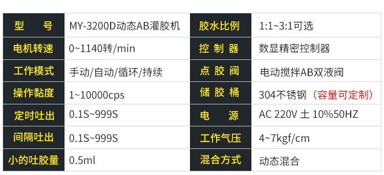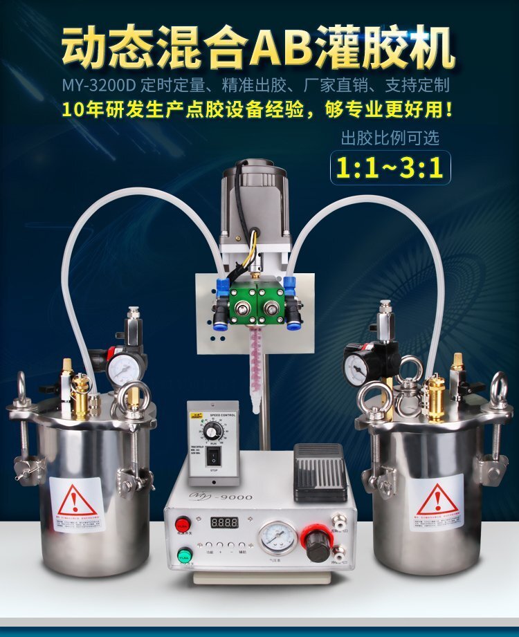 MY-3200D動(dòng)態(tài)攪拌雙液灌膠機(jī)是由“精密數(shù)顯點(diǎn)膠機(jī)+壓力桶+電動(dòng)攪拌雙液閥+調(diào)速器+支架”組合而成的AB雙液灌膠套裝,點(diǎn)膠機(jī)功能模式多,操作簡(jiǎn)易,穩(wěn)定高效;電動(dòng)攪拌雙液閥有帶復(fù)動(dòng)式回吸功能,斷膠干凈,不拉絲,不滴漏,攪拌機(jī)帶動(dòng)混合管高速運(yùn)轉(zhuǎn),使AB膠水混合更均勻,不易固化;調(diào)速控制器,可根據(jù)AB兩種膠水的粘稠度,合理有效的控制攪拌電機(jī)的運(yùn)轉(zhuǎn)速度;套裝具有控制穩(wěn)定、灌膠/點(diǎn)膠精確、應(yīng)用領(lǐng)域廣泛、套裝組件可靈活更換、使用壽命長(zhǎng)、節(jié)省成本等優(yōu)勢(shì),適合工程/工廠長(zhǎng)期生產(chǎn)使用;有大量現(xiàn)貨供應(yīng),歡迎咨詢采購(gòu)!