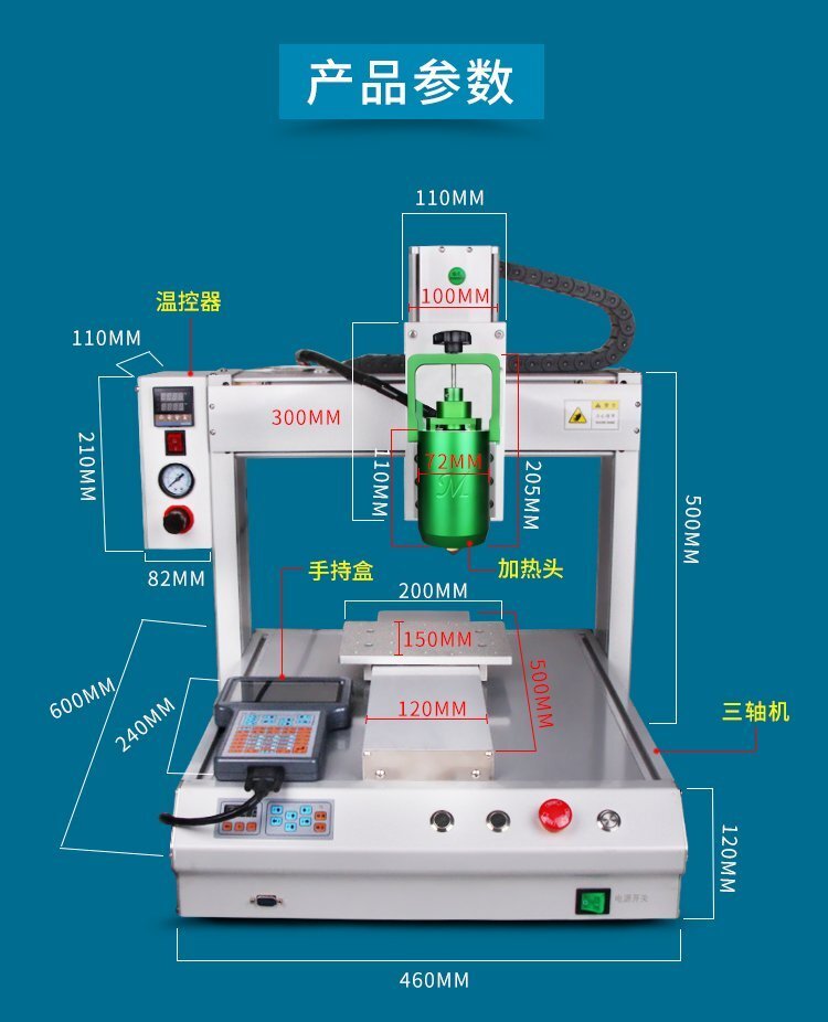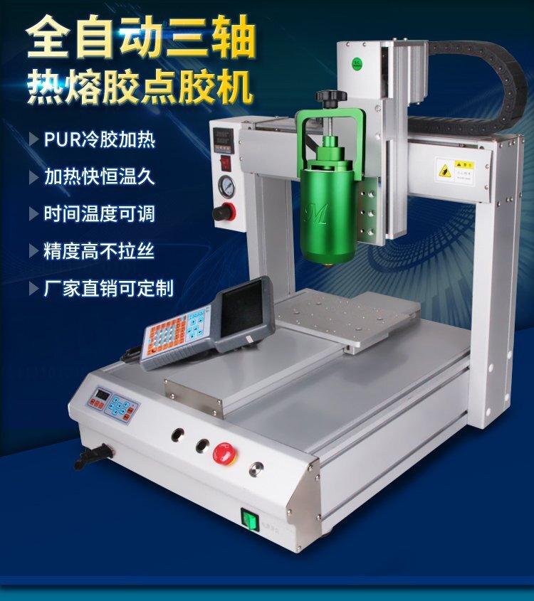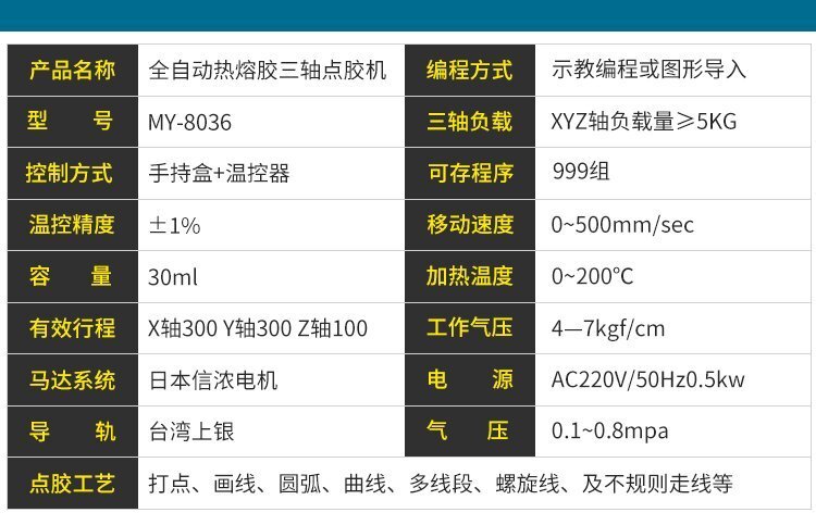 MY-8036是由“331三軸機(jī)+9600溫控器+511PUR點(diǎn)膠閥”組合而成的全自動(dòng)熱熔膠 點(diǎn)膠套裝;三軸機(jī)具有畫點(diǎn)、線、面、弧、圓及不規(guī)則曲線連續(xù)補(bǔ)間,可存儲(chǔ)999個(gè)點(diǎn)膠工藝文 檔;溫控器加熱范圍在0~200℃,具有控制穩(wěn)定、精準(zhǔn)、實(shí)用、操作方便等特點(diǎn);點(diǎn)膠閥加熱速 度快,持久恒溫,耐腐蝕,拆裝簡單便捷等特點(diǎn);全自動(dòng)點(diǎn)膠,省工省時(shí),提高生產(chǎn)效率。