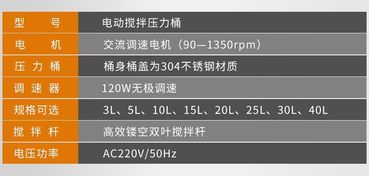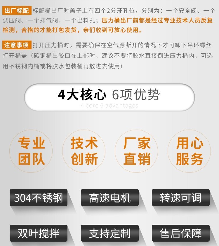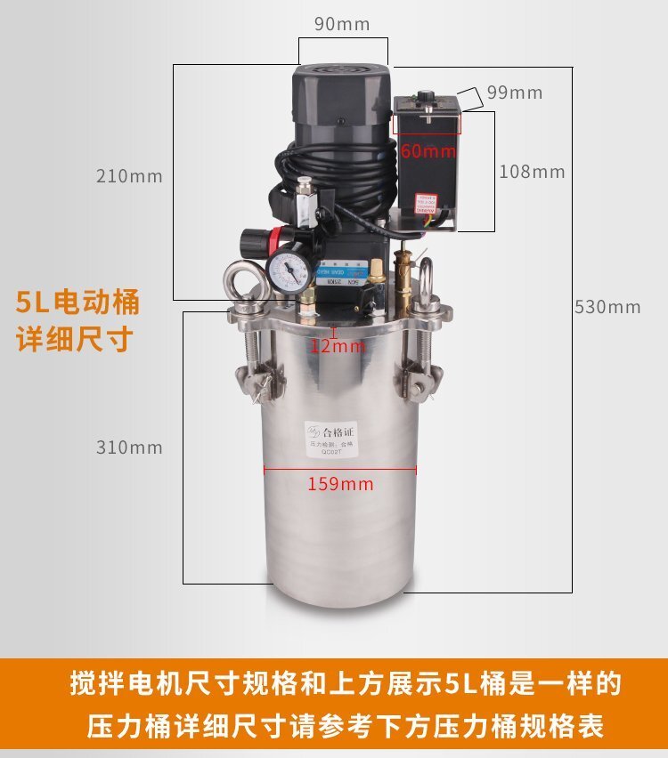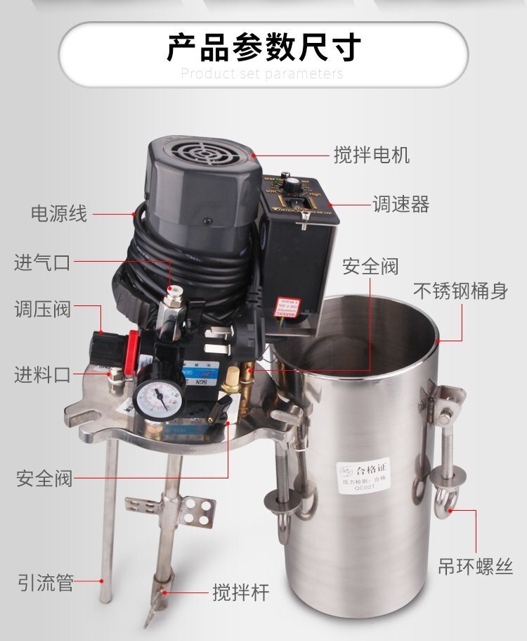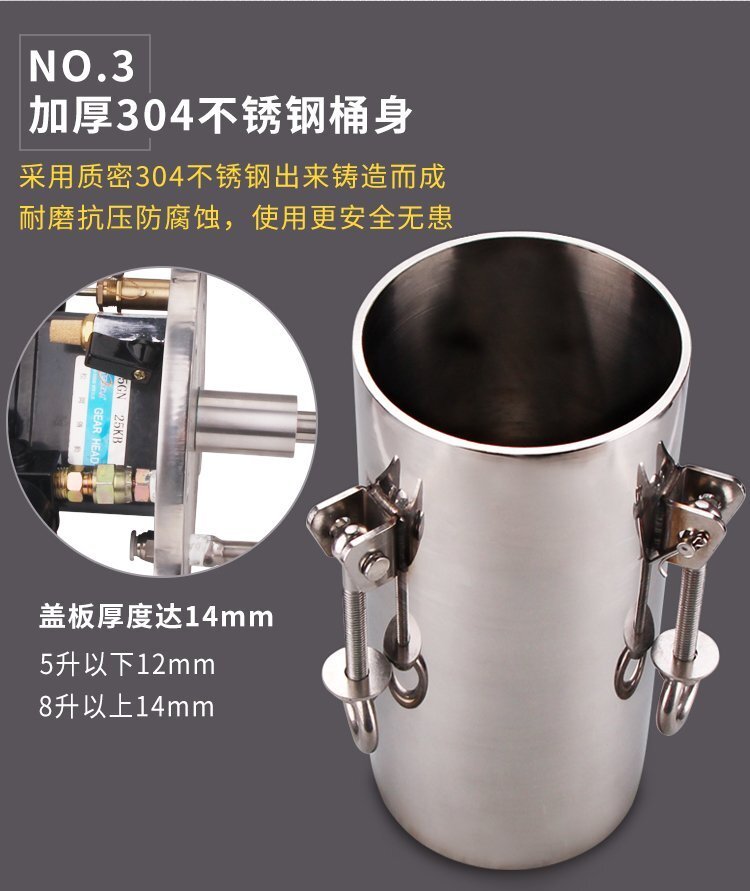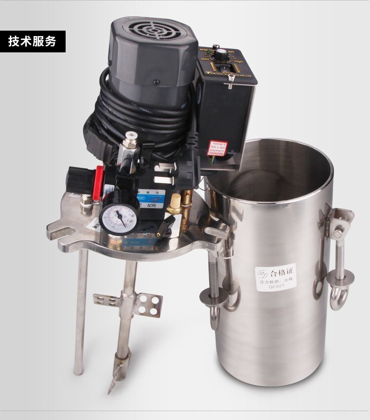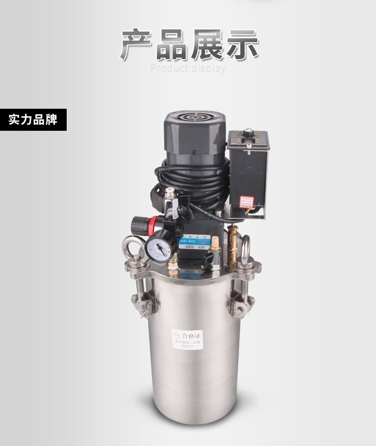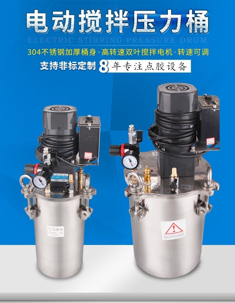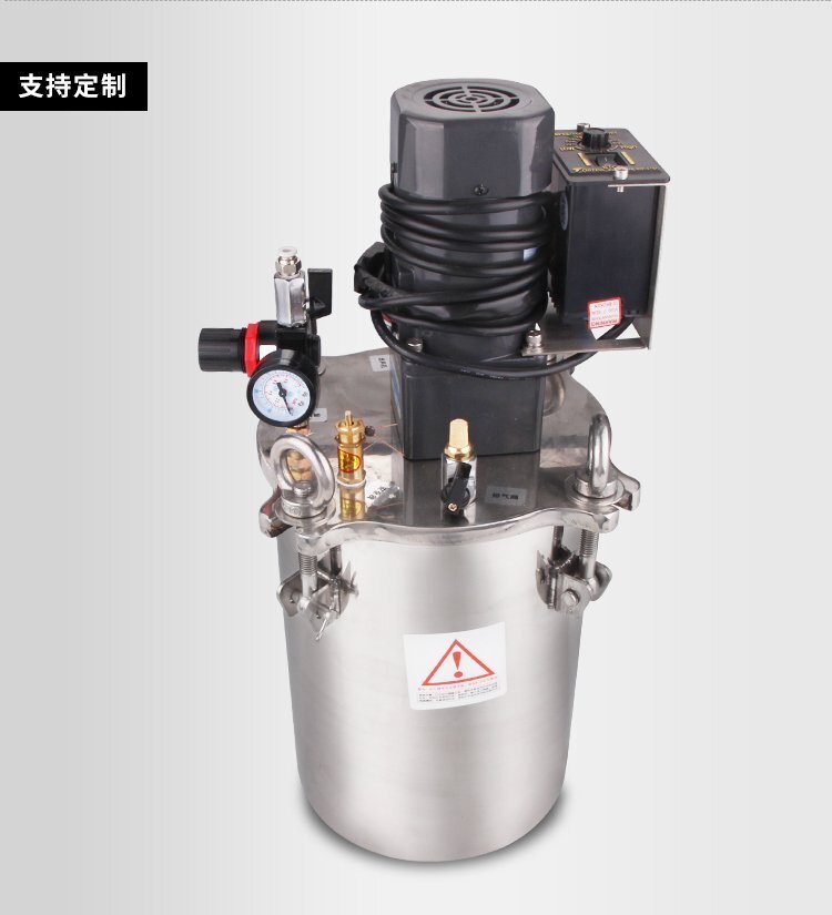 攪拌壓力桶出膠口在上部,在標(biāo)配壓力桶基礎(chǔ)上加了攪拌電機,可以防止膠水固化,使出膠順暢均衡;電動款的搭配無極調(diào)速器使用,可根據(jù)膠水粘稠度調(diào)節(jié)電機轉(zhuǎn)動速度,氣動款則控制氣壓調(diào)節(jié);在工業(yè)點膠灌膠實際應(yīng)用中,效果十分卓越;壓力桶使用304不銹鋼材料,耐腐蝕性強,加厚的桶壁和桶蓋,安全有保證,在作業(yè)中可以放心使用;適合工程/工廠長期生產(chǎn)使用;有大量現(xiàn)貨供應(yīng),歡迎咨詢采購!