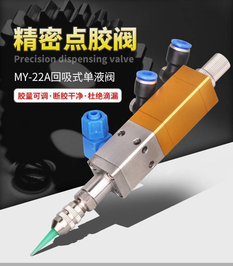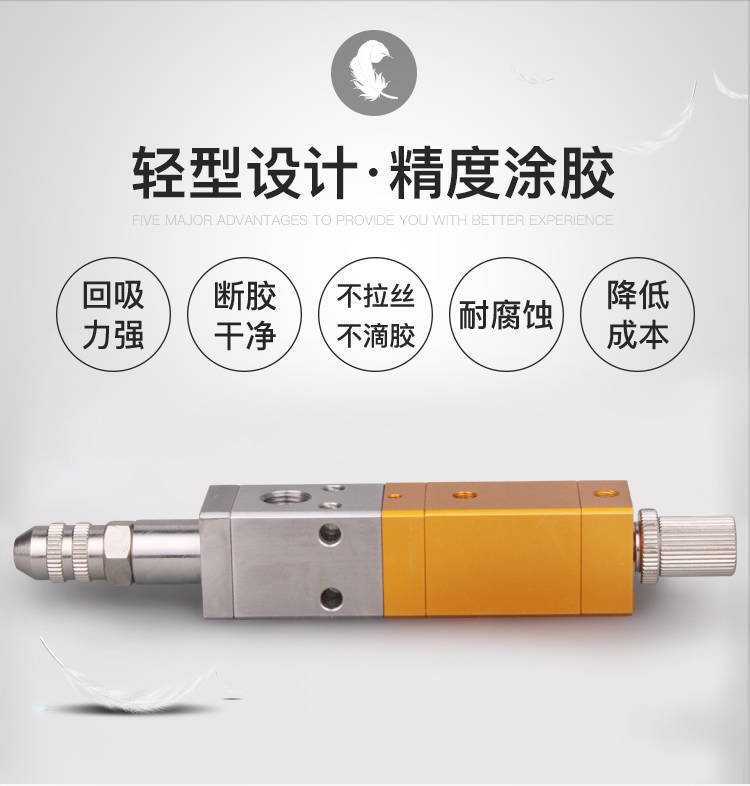 回吸式點(diǎn)膠閥采用向上運(yùn)動(dòng)關(guān)膠結(jié)構(gòu),使停膠同時(shí)瞬間回吸斷膠,減少余留針頭上的殘膠,使點(diǎn)膠不產(chǎn)生漏滴、拉絲等現(xiàn)象。膠閥本體經(jīng)鋁合金陽(yáng)極氧化處理,密封材料采用最新四氟材料,接觸膠體部分均為耐腐蝕材料。
