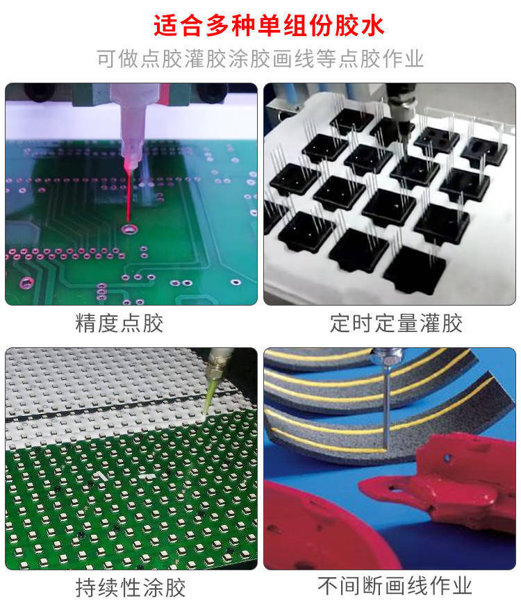 一般常見(jiàn)UV膠、silicon、EPOXY、紅膠、銀膠、A B膠、COB黑膠、導(dǎo)電膠、散熱鋁膏、瞬間膠、熱熔膠 運(yùn)用行業(yè):光學(xué),光電行業(yè)生化行業(yè) 光伏太陽(yáng)能行業(yè) SMD / SMT 表面貼裝半導(dǎo)體制造行業(yè) 醫(yī)藥行業(yè) LCD / LED 實(shí)驗(yàn)室 電子元器件行業(yè) 半導(dǎo)體封裝 PCB電子零件固定及保護(hù) LCD玻璃機(jī)板封裝粘接 移動(dòng)電話(huà)機(jī)板涂布或按鍵點(diǎn)膠 揚(yáng)聲器點(diǎn)膠 電池盒點(diǎn)膠封合 汽械車(chē)零件涂布 五金零件涂布接著 定量氣體、液體填充涂布 芯片邦定